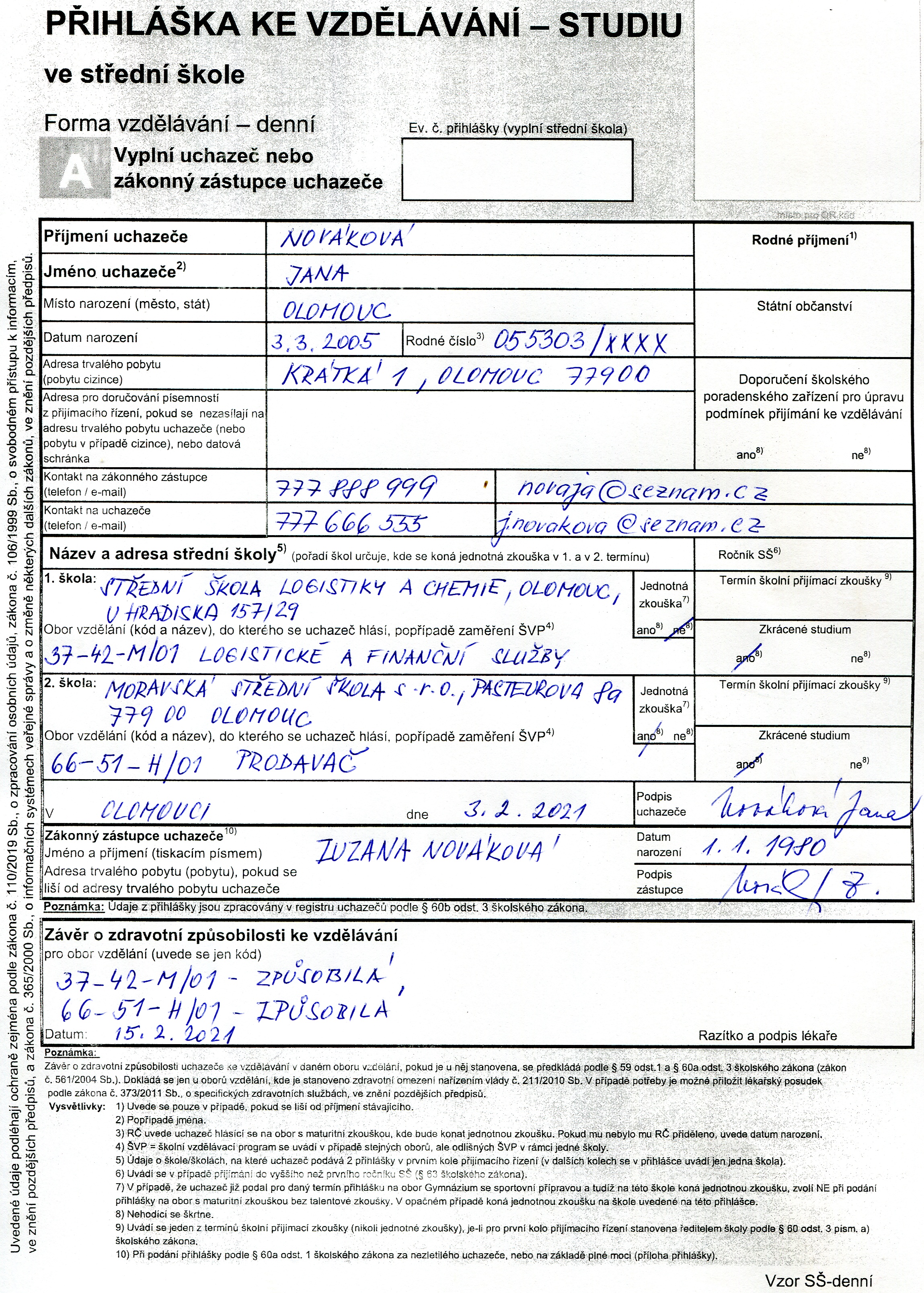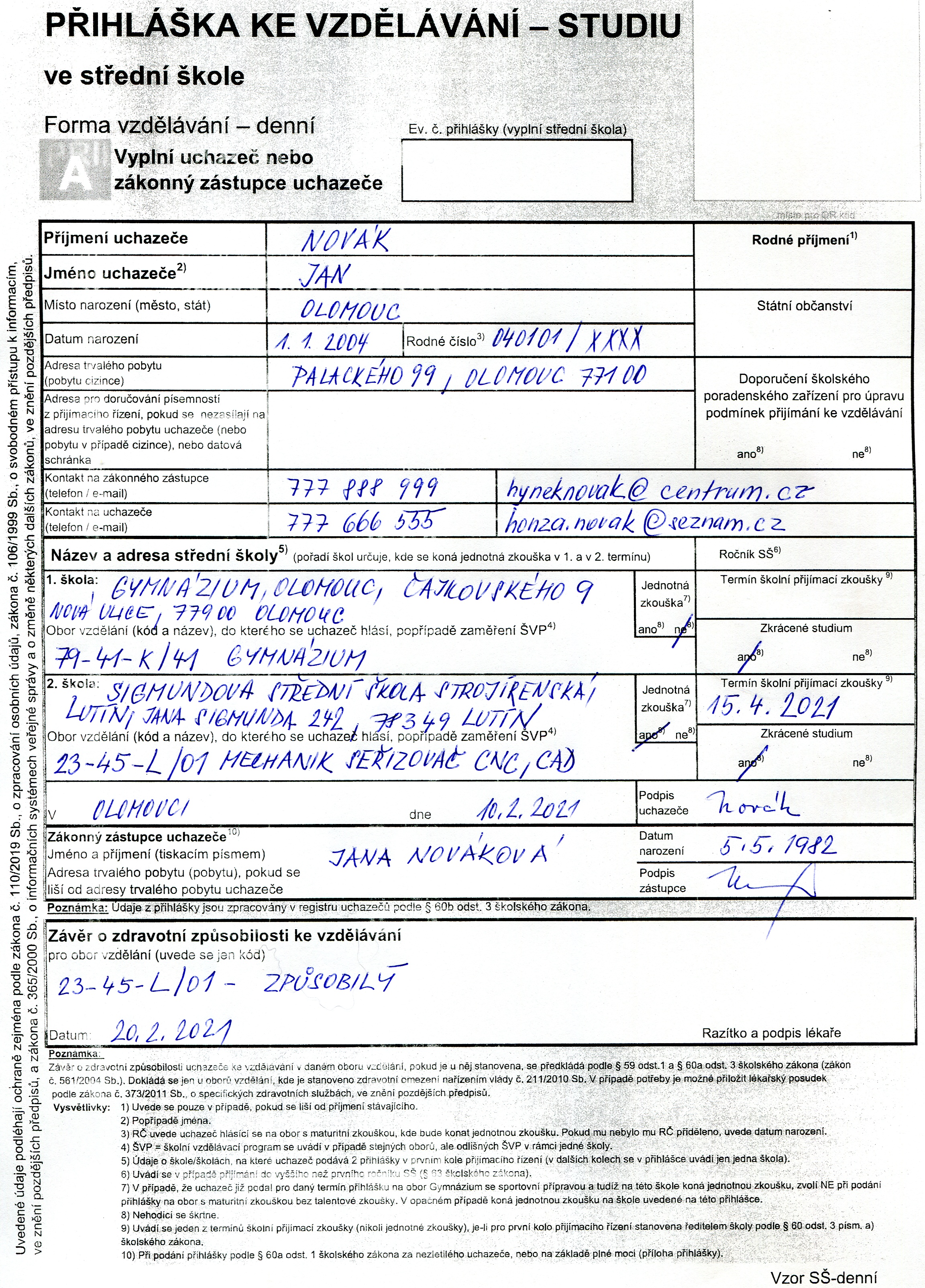 Přihláška na střední školu (vzor 1)